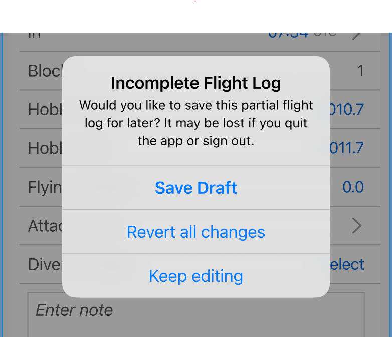 Allow pilots to save partial flight logs without requiring a single sitting or internet connection